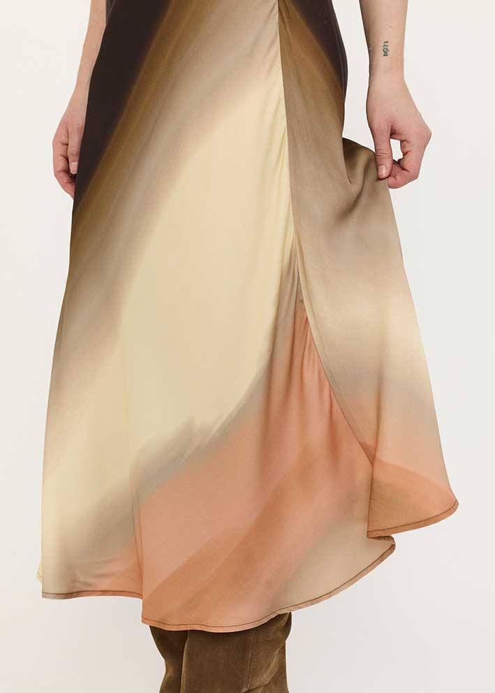 Elegant midi-længde med feminint print der fanger solnedgangens varme farver. Pasformen smigrer figuren og giver et sofistikeret udtryk.