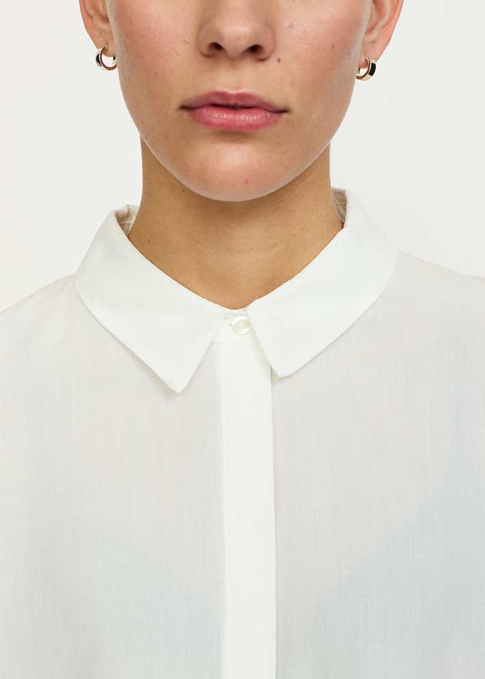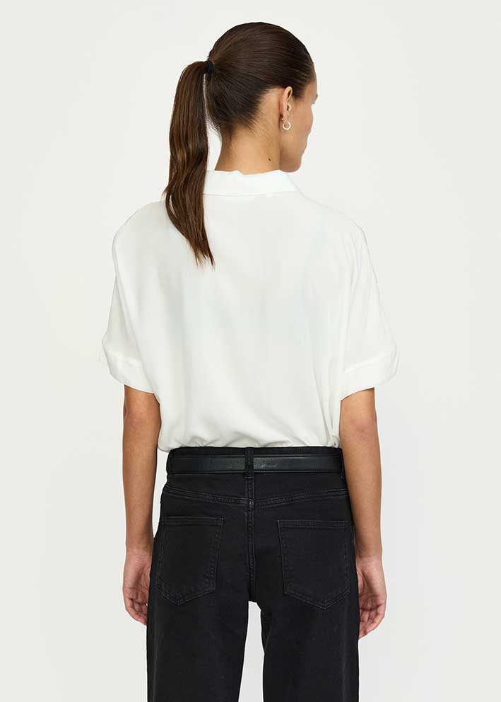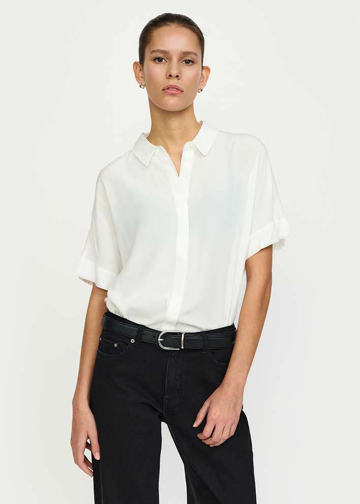 Klassisk kortærmet hvid Freedom skjorte fra Soft Rebels, designet i lækkert miljøvenligt viscose. Skjorten har en løs pasform, korte ærmer, en klassisk skjortekrave, skjult knaplukning og lave skuldersømme.