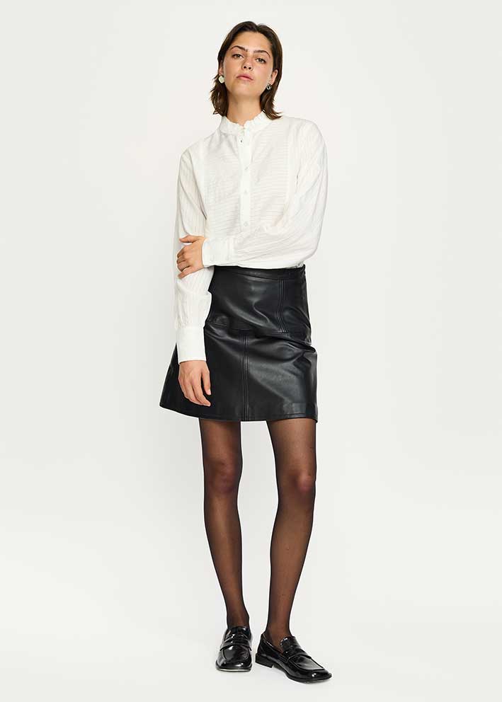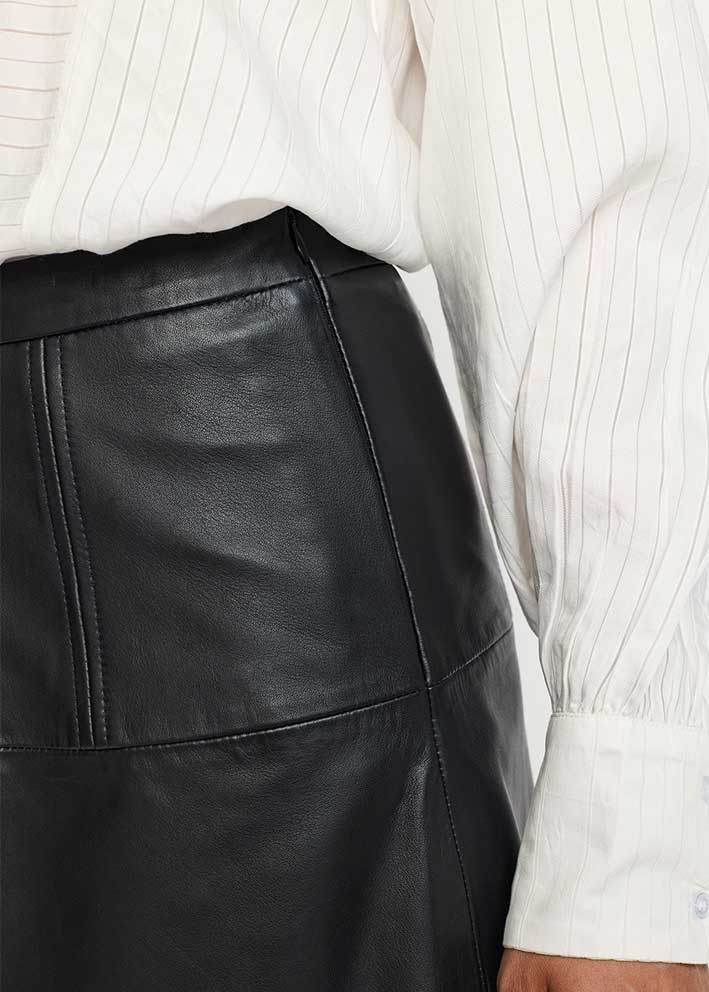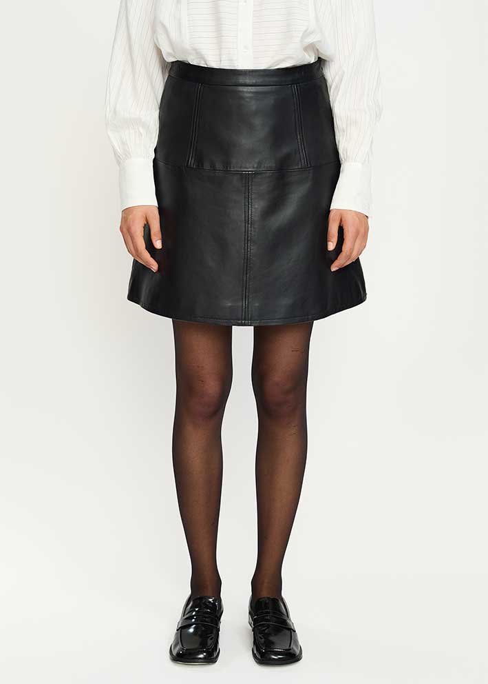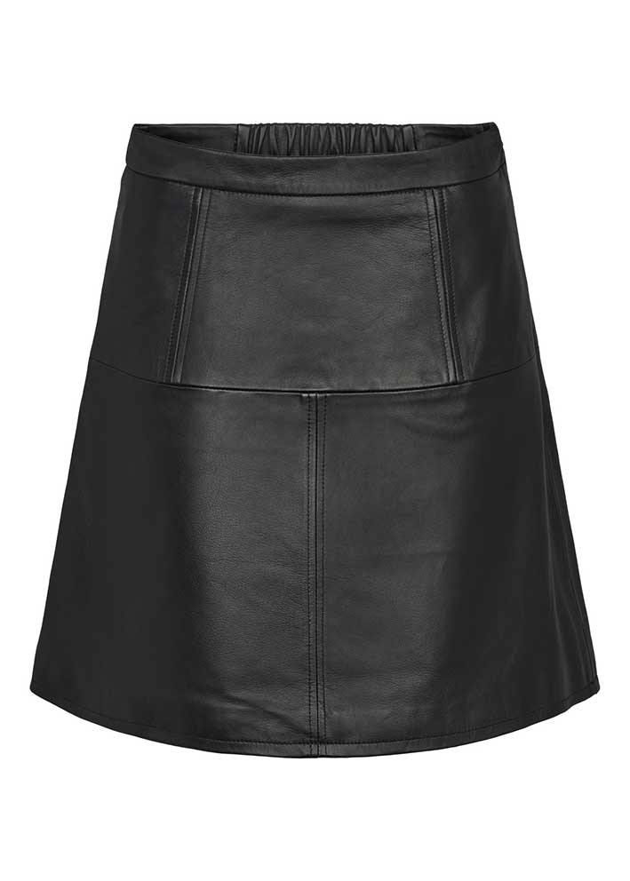 Frisk kort sort Della skindnederdel fra Soft Rebels, designet i et elegant A-snit med effektsyninger. Nederdelen har fast talje foran og elastik på ryggen, der sikrer at den sidder supergodt.