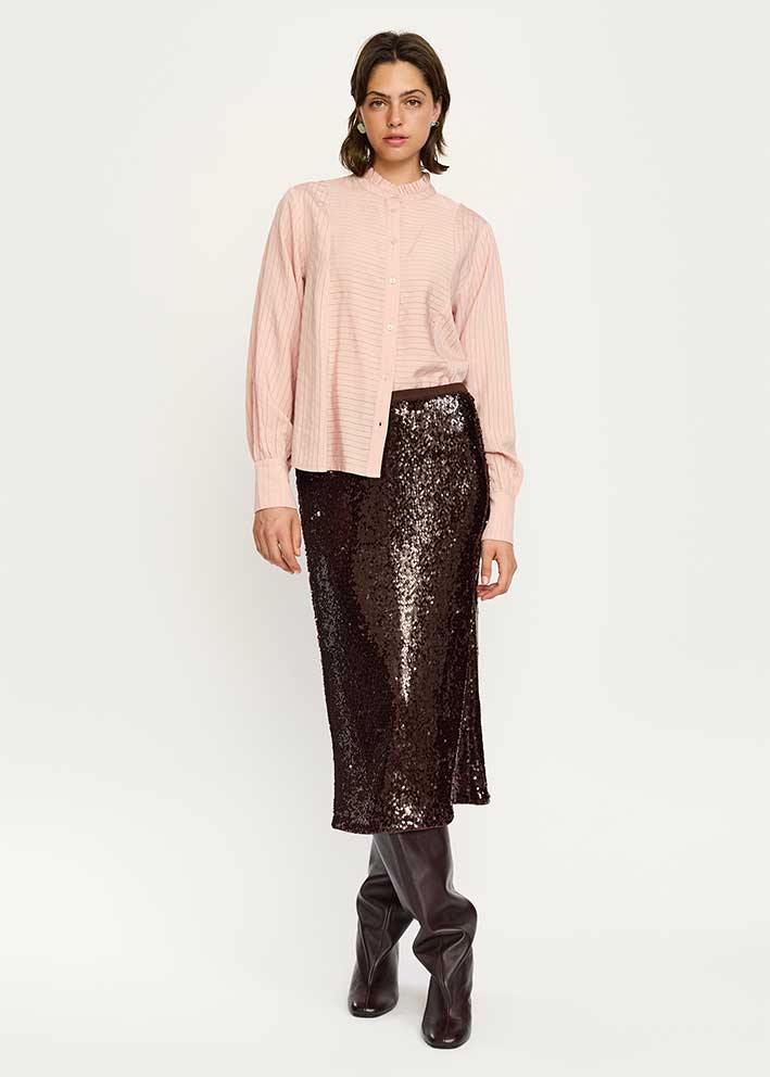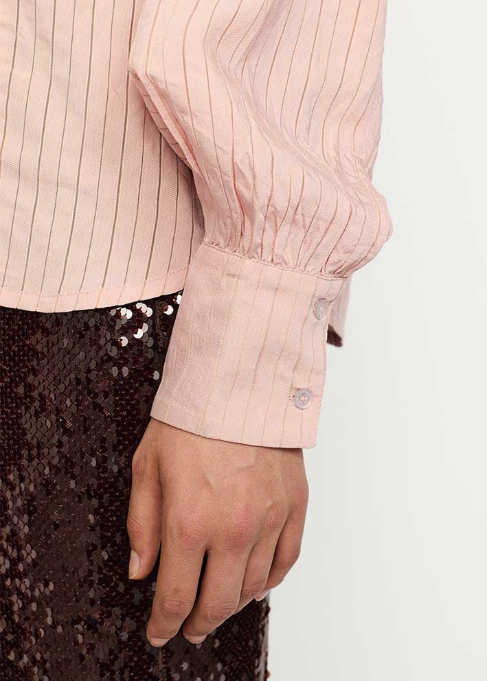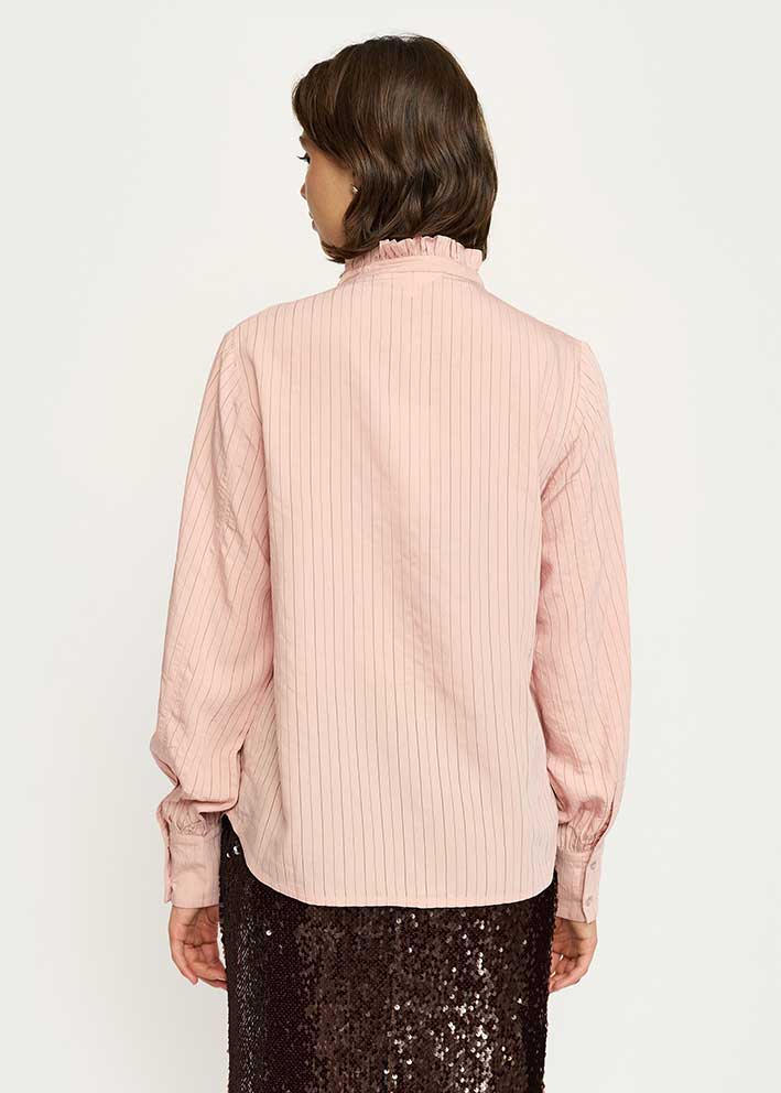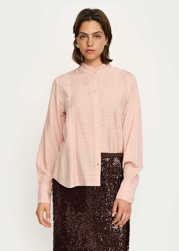 Smuk rosa Jemma skjorte fra Soft Rebels, designet i en lækker miljøvenlig kvalitet med fine små gyldne striber. Skjorten har et elegant snit med lille stående flæsekrave, knapper ned foran og lange ærmer med manchetter.