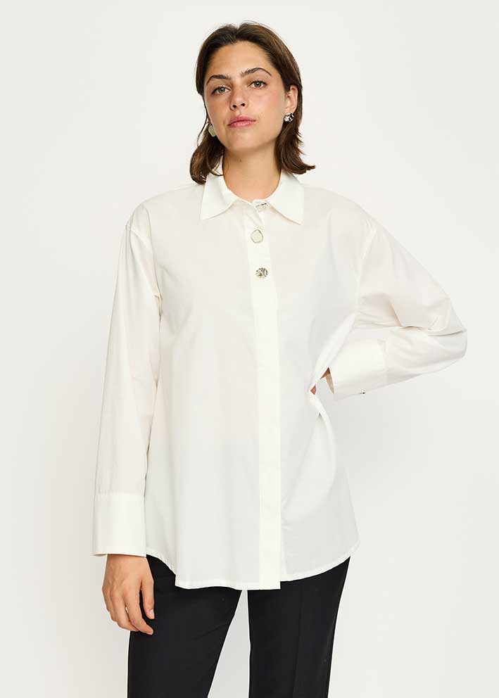 Klassisk stilren hvid Kiana skjorte fra Soft Rebels, designet "with a twist" i form af de smukke smykkeagtige knapper, der giver et eksklusivt udtryk.