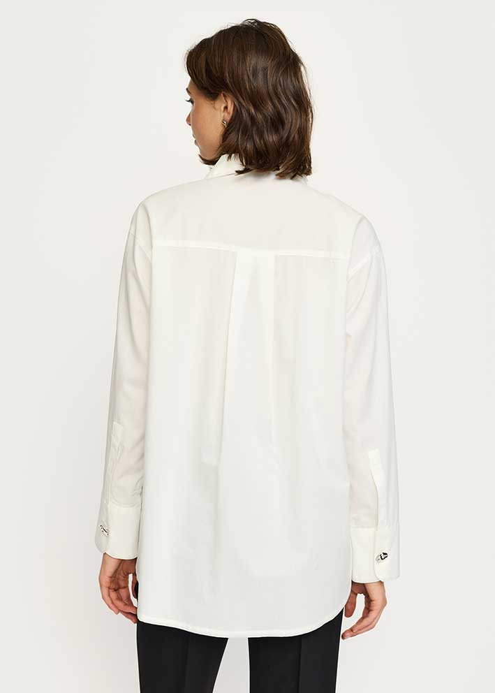 Skjorten har et løst snit, almindelig skjortekrave og lange ærmer.