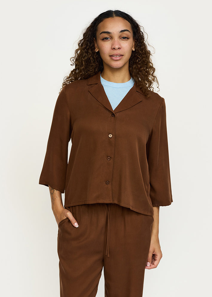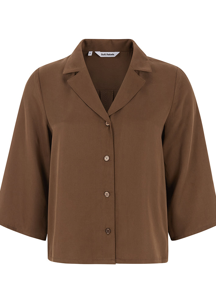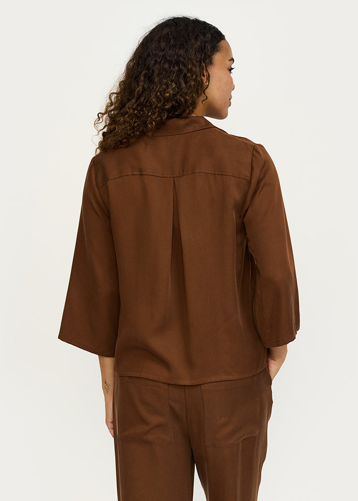 Skøn mørkebrun Uma skjorte fra Soft Rebels, designet i lækkert lyocell, der er virkelig behageligt at have på. Skjorten har et løst boxy snit med halvlange vide ærmer, lille krave og knapper ned foran.