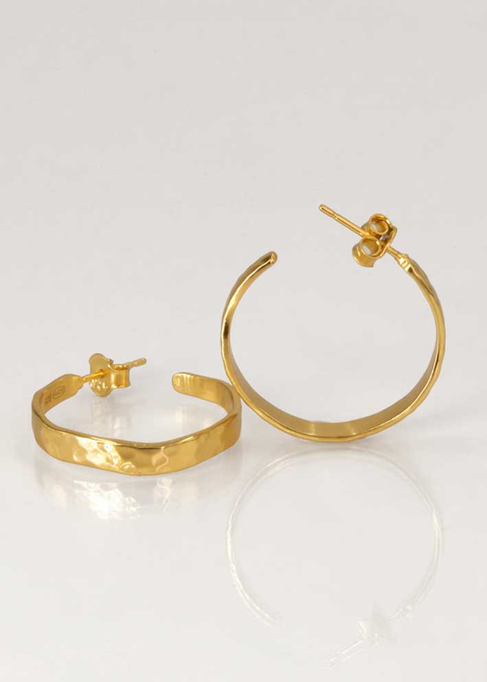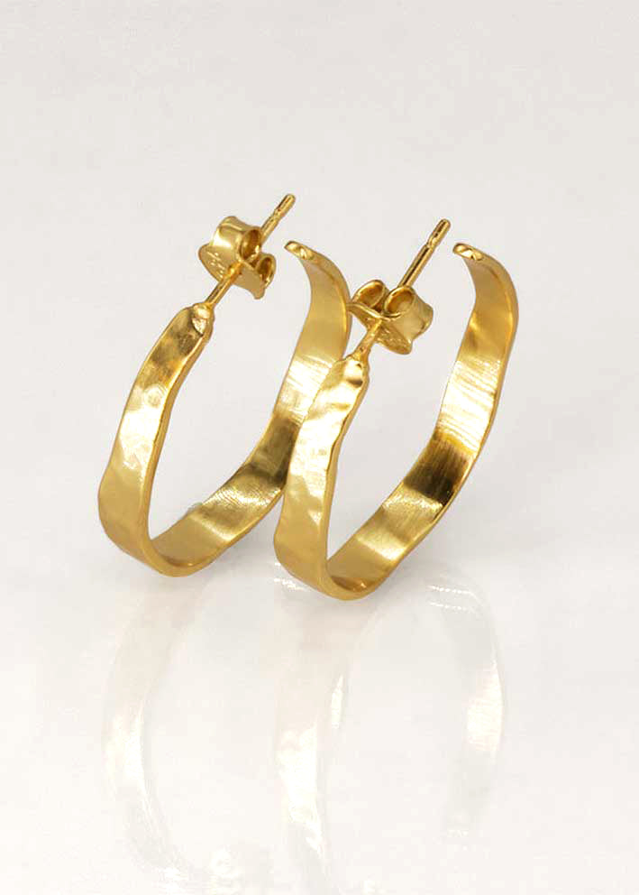 Smukke Aura øreringe fra Stone CPH, designet i forgyldt sterling sølv. Disse øreringe, med deres fascinerende runde design og hamrede tekstur, indkapsler den tidløse tiltrækning af en auras mystiske glød.