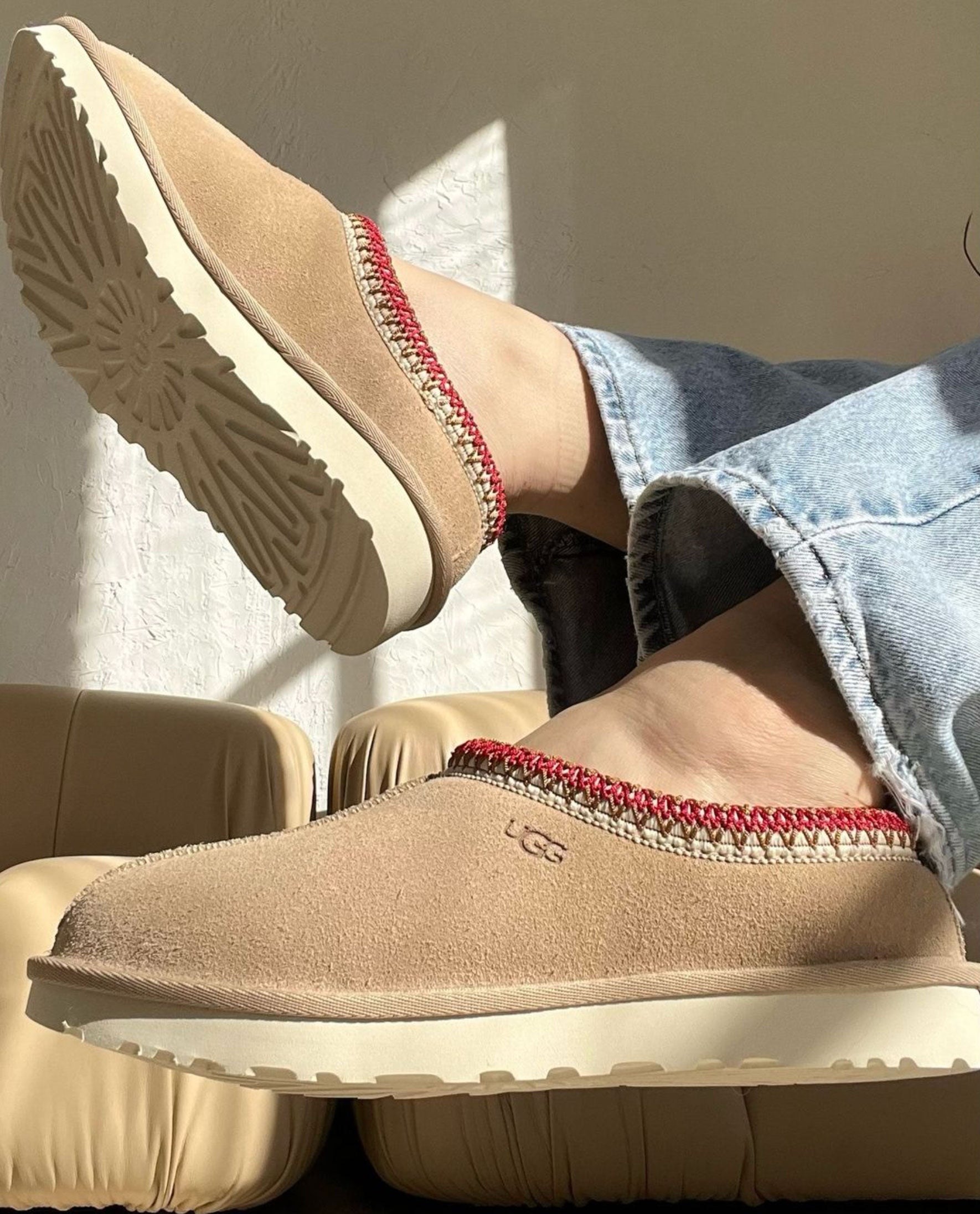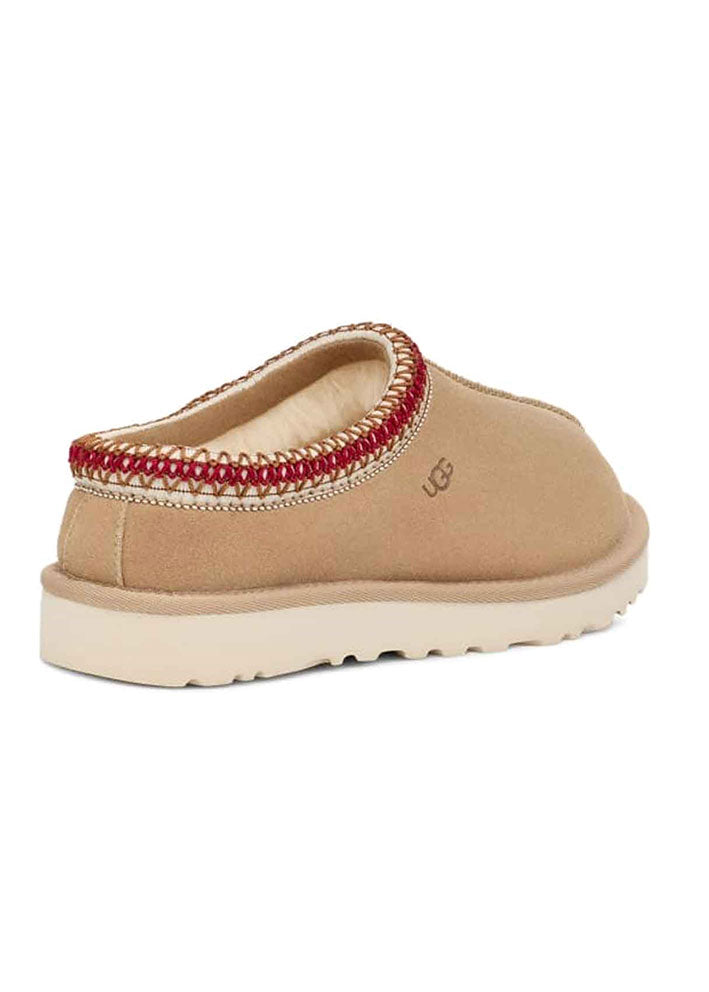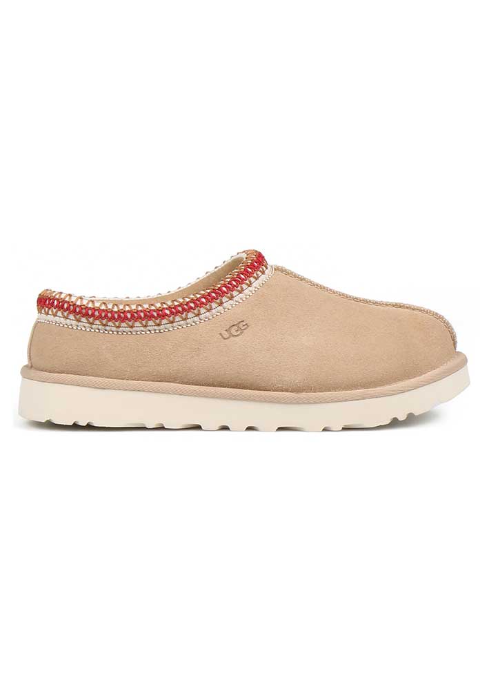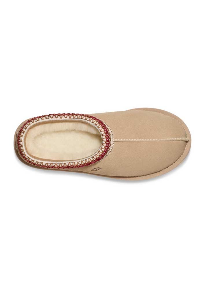 Superlækker klassisk sandfarvet Tasman sko fra UGG med kirsebærrødt kantbroderi. Tasman er en sko til alle lejligheder - designet med UGGs samme lette, holdbare ydersål som den klassiske bamsestøvle, så du kan have den på både indendørs og udendørs.